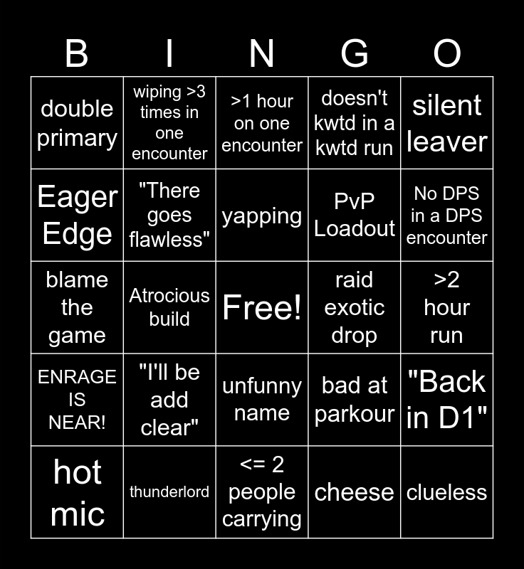 This bingo card has a free space and 24 words: "I'll be add clear", thunderlord, yapping, hot mic, silent leaver, double primary, Eager Edge, wiping >3 times in one encounter, raid exotic drop, unfunny name, PvP Loadout, blame the game, bad at parkour, "Back in D1", "There goes flawless", cheese, >2 hour run, >1 hour on one encounter, No DPS in a DPS encounter, Atrocious build, clueless, ENRAGE IS NEAR!, doesn't kwtd in a kwtd run and <= 2 people carrying.