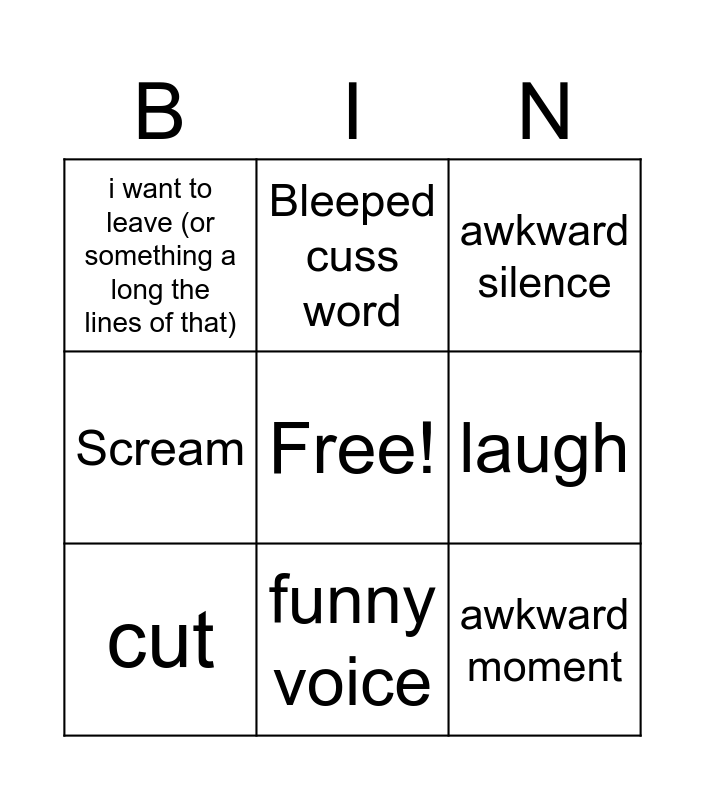 This bingo card has a free space and 8 words: Scream, Bleeped cuss word, laugh, cut, awkward silence, i want to leave (or something a long the lines of that), funny voice and awkward moment.
