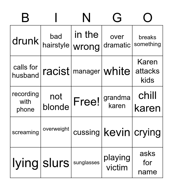 This bingo card has a free space and 24 words: overweight, slurs, manager, lying, breaks something, drunk, calls for husband, bad hairstyle, grandma karen, cussing, white, recording with phone, kevin, crying, racist, playing victim, chill karen, in the wrong, Karen attacks kids, not blonde, asks for name, screaming, over dramatic and sunglasses.