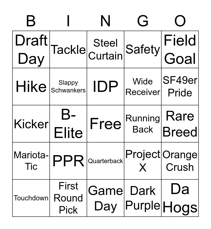 This bingo card has a free space and 24 words: PPR, First Round Pick, IDP, Touchdown, Field Goal, Draft Day, Hike, Tackle, Running Back, Quarterback, Wide Receiver, Kicker, Project X, Orange Crush, Slappy Schwankers, Dark Purple, Rare Breed, Steel Curtain, SF49er Pride, B-Elite, Da Hogs, Mariota-Tic, Safety and Game Day.