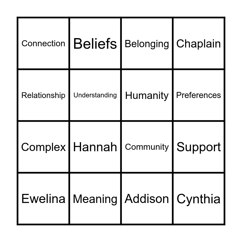 This bingo card has 29 words: Spirituality, Religion, Support, Respect, Connection, Belonging, Humanity, H.O.P.E, Meaning, Purpose, Addison, Ewelina, Ben, Vanessa, Hannah, Adrian, Zahra, Cynthia, Relationship, Community, Society, Culture, Complex, Understanding, Chaplain, Beliefs, Values, Preferences and No Judgement.