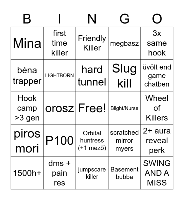 This bingo card has a free space and 24 words: P100, dms + pain res, hard tunnel, 1500h+, 3x same hook, Mina, béna trapper, first time killer, Blight/Nurse, Orbital huntress (+1 mező), Slug kill, Hook camp >3 gen, scratched mirror myers, 2+ aura reveal perk, LIGHTBORN, Basement bubba, Wheel of Killers, Friendly Killer, üvölt end game chatben, orosz, SWING AND A MISS, piros mori, megbasz and jumpscare killer.