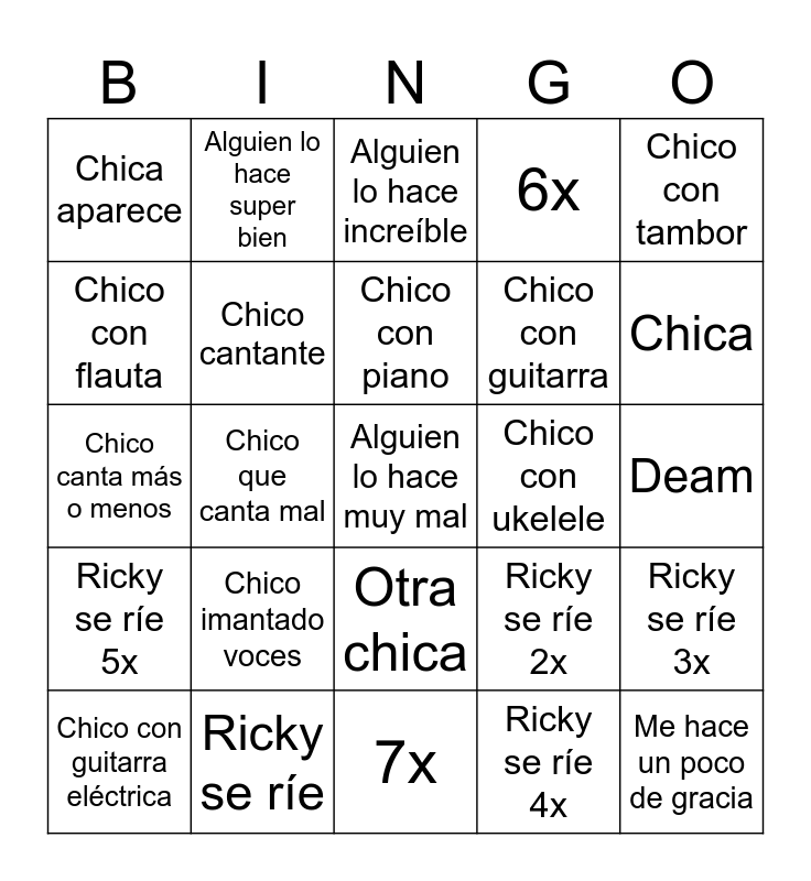 This bingo card has a free space and 24 words: Chico imantado voces, Ricky se ríe, Chico con piano, Chico con guitarra eléctrica, Chico con tambor, Chica aparece, Chico con flauta, Alguien lo hace super bien, Chico con ukelele, Otra chica, Chico con guitarra, Chico canta más o menos, Ricky se ríe 2x, Ricky se ríe 3x, Chico cantante, Ricky se ríe 4x, Deam, Alguien lo hace increíble, Chica, Chico que canta mal, Me hace un poco de gracia, Ricky se ríe 5x, 6x and 7x.