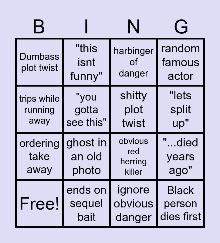 This bingo card has 23 words: Black person dies first, Mirror scare, "lets split up", jumpscare over something not scary, trips while running away, Dumbass plot twist, "you gotta see this", "this isnt funny", Free!, cop dies right before saving them, ghost in an old photo, ordering take away, possessed child, dumbass local legend, ends on sequel bait, no phone reception, harbinger of danger, obvious red herring killer, shitty plot twist, "...died years ago", random famous actor, ignore obvious danger and think its a prank.