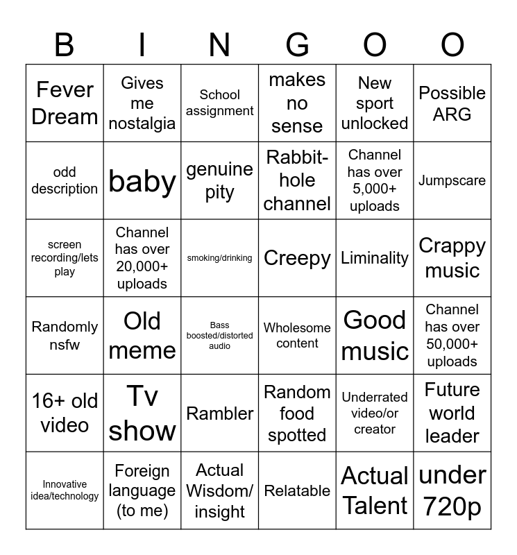 This bingo card has 54 words: Innovative idea/technology, Old meme, Conspiracy theory, Creepy, Underrated video/or creator, "I've been to this place", Fever Dream, May be mentally unwell, School assignment, Random food spotted, New sport unlocked, Future world leader, Randomly nsfw, Foreign language (to me), Possibly a crime, Rabbit-hole channel, Liminality, Jumpscare, FREE SPACE, Channel has over 20,000+ uploads, Bass boosted/distorted audio, Wholesome content, Good music, Possible ARG, Life-hack, Gives me nostalgia, Actual Wisdom/ insight, Channel has over 10,000+ uploads, Actual Talent, Crappy music, Animal spotted, Angry human, Happy human, Relatable, Channel has over 5,000+ uploads, under 720p, screen recording/lets play, Tv show, Rambler, makes no sense, possible cult, too young for the internet, 16+ old video, Channel has over 1,000+ uploads, smoking/drinking, Possible ARG, old guy, Channel has over 50,000+ uploads, odd description, baby, genuine pity, Possible scam, Possible lost media and advertisement.