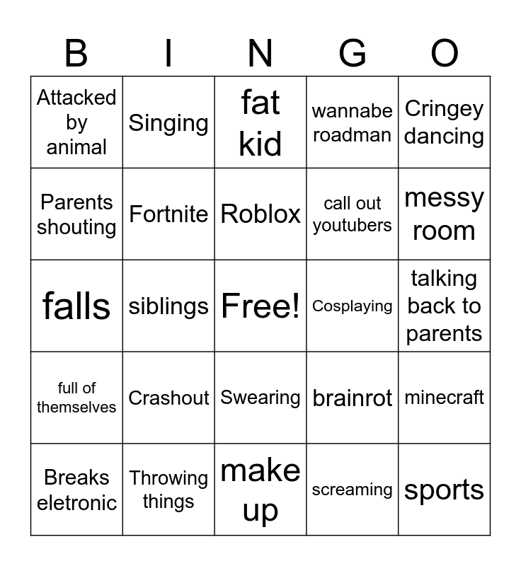 This bingo card has a free space and 24 words: Crashout, Throwing things, Roblox, Breaks eletronic, Cringey dancing, Attacked by animal, Parents shouting, Singing, Cosplaying, Swearing, call out youtubers, falls, brainrot, minecraft, Fortnite, screaming, talking back to parents, fat kid, messy room, siblings, sports, full of themselves, wannabe roadman and make up.
