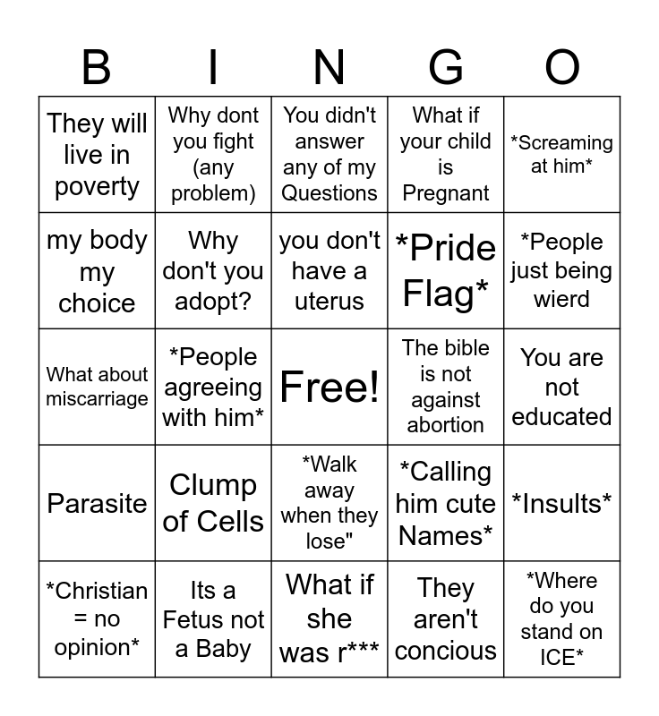 This bingo card has a free space and 24 words: Clump of Cells, Its a Fetus not a Baby, you don't have a uterus, *Christian = no opinion*, *Screaming at him*, They will live in poverty, my body my choice, Why dont you fight (any problem), The bible is not against abortion, *Walk away when they lose", *Pride Flag*, What about miscarriage, *Calling him cute Names*, *Insults*, Why don't you adopt?, They aren't concious, You are not educated, You didn't answer any of my Questions, *People just being wierd, *People agreeing with him*, *Where do you stand on ICE*, Parasite, What if your child is Pregnant and What if she was r***.