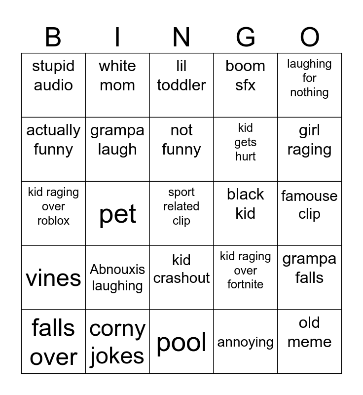 This bingo card has a free space and 24 words: Abnouxis laughing, corny jokes, not funny, falls over, laughing for nothing, stupid audio, actually funny, white mom, black kid, kid crashout, kid gets hurt, kid raging over roblox, kid raging over fortnite, grampa falls, grampa laugh, annoying, famouse clip, lil toddler, girl raging, pet, old meme, vines, boom sfx and pool.