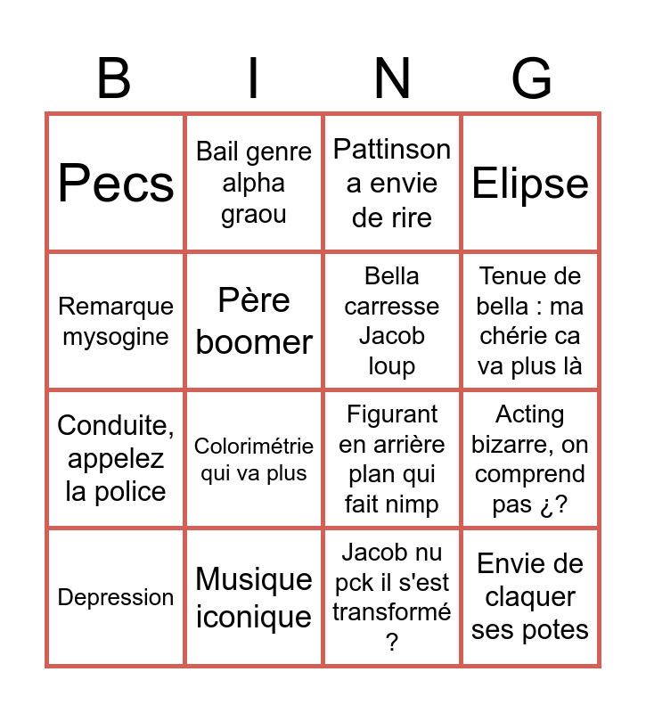 This bingo card has 16 words: Musique iconique, Acting bizarre, on comprend pas ¿?, Pattinson a envie de rire, Pecs, Conduite, appelez la police, Bail genre alpha graou, Figurant en arrière plan qui fait nimp, Jacob nu pck il s'est transformé ?, Remarque mysogine, Père boomer, Depression, Elipse, Colorimétrie qui va plus, Tenue de bella : ma chérie ca va plus là, Bella carresse Jacob loup and Envie de claquer ses potes.