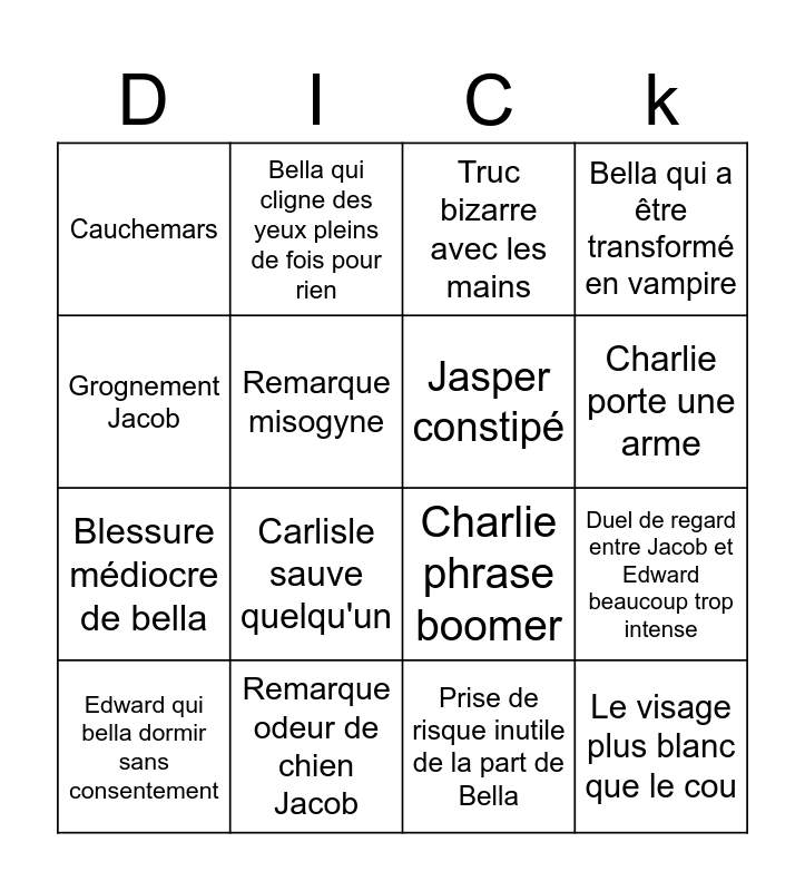 This bingo card has 16 words: Remarque odeur de chien Jacob, Duel de regard entre Jacob et Edward beaucoup trop intense, Truc bizarre avec les mains, Cauchemars, Blessure médiocre de bella, Bella qui cligne des yeux pleins de fois pour rien, Charlie phrase boomer, Prise de risque inutile de la part de Bella, Grognement Jacob, Remarque misogyne, Edward qui bella dormir sans consentement, Bella qui a être transformé en vampire, Carlisle sauve quelqu'un, Charlie porte une arme, Jasper constipé and Le visage plus blanc que le cou.