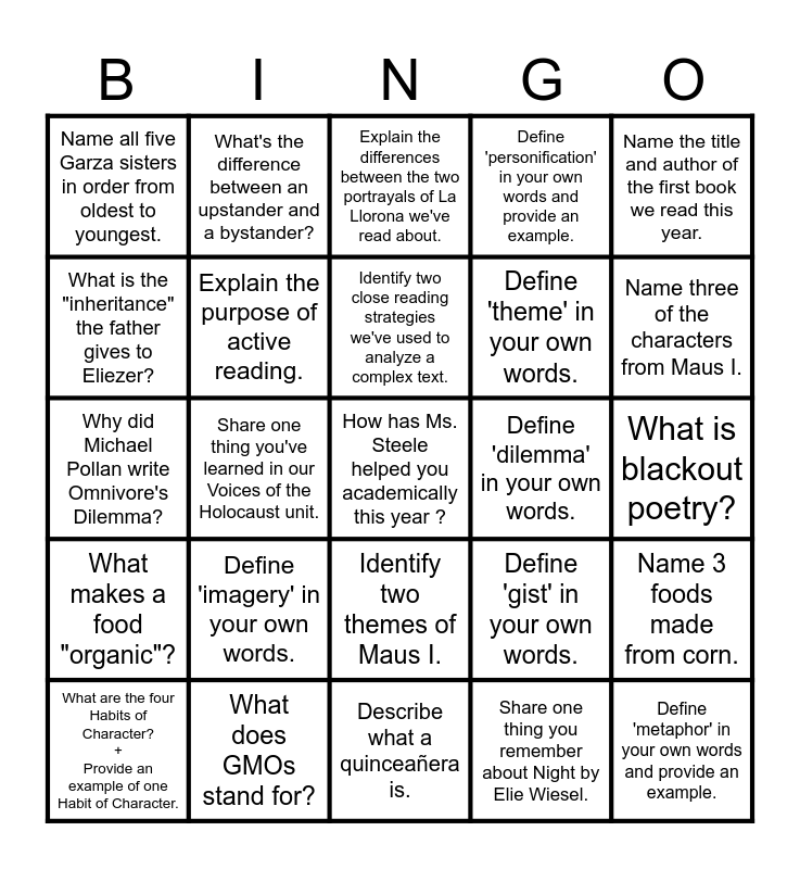 This bingo card has a free space and 24 words: Define 'imagery' in your own words., What does GMOs stand for?, Identify two close reading strategies we've used to analyze a complex text., What are the four Habits of Character? + Provide an example of one Habit of Character., Name the title and author of the first book we read this year., Name all five Garza sisters in order from oldest to youngest., What is the "inheritance" the father gives to Eliezer?, What's the difference between an upstander and a bystander?, Define 'dilemma' in your own words., Identify two themes of Maus I., Define 'theme' in your own words., Why did Michael Pollan write Omnivore's Dilemma?, Define 'gist' in your own words., Name 3 foods made from corn., Explain the purpose of active reading., Share one thing you remember about Night by Elie Wiesel., What is blackout poetry?, Explain the differences between the two portrayals of La Llorona we've read about., Name three of the characters from Maus I., Share one thing you've learned in our Voices of the Holocaust unit., Define 'metaphor' in your own words and provide an example., What makes a food "organic"?, Define 'personification' in your own words and provide an example. and Describe what a quinceañera is..