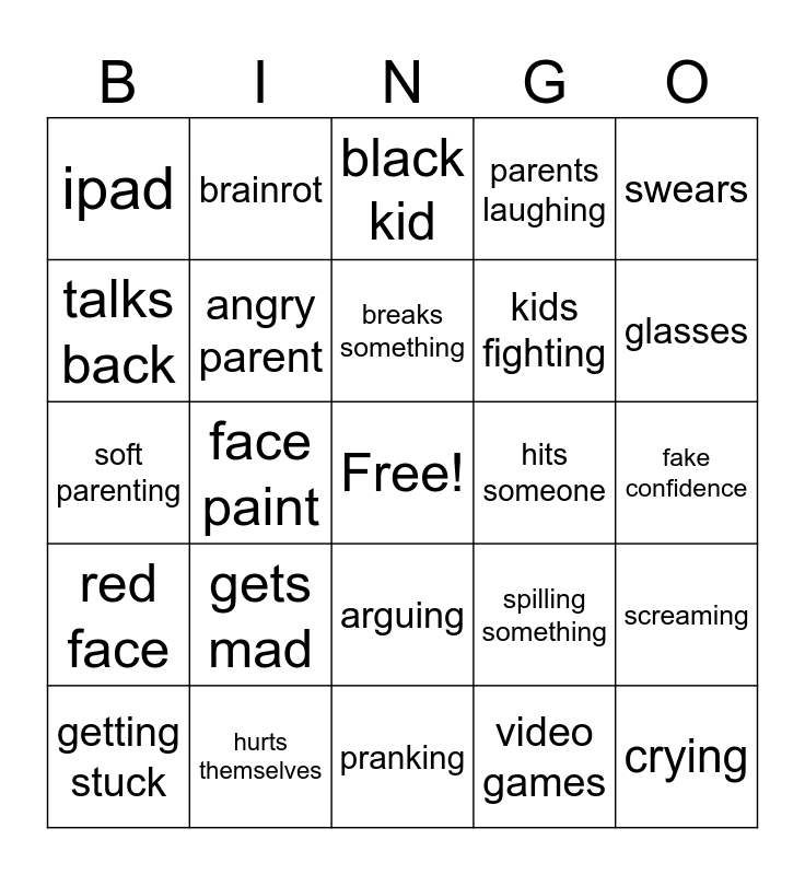 This bingo card has a free space and 24 words: gets mad, hurts themselves, breaks something, getting stuck, swears, ipad, talks back, brainrot, hits someone, arguing, kids fighting, soft parenting, spilling something, screaming, angry parent, video games, fake confidence, black kid, glasses, face paint, crying, red face, parents laughing and pranking.