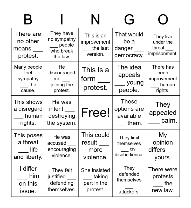 This bingo card has a free space and 35 words: They are strongly opposed ___ violence., I disapprove ___ people breaking the law., We are responsible ___ our own actions., He discouraged me ___ joining the protest., This could result ___ more violence., That would be a danger ___ democracy., Many people feel sympathy ___ the cause., Peaceful protest is preferable ___ violence., This is a form ___ protest., They restrict themselves ___ non-violent protest., This shows a disregard ___ human rights., They live under the threat ___ imprisonment., You can’t excuse them ___ their actions., They had to resort ___ violence., There are no other means ___ protest., These options are available ___ them., They defended themselves ___ attackers., He was intent ___ destroying the system., This poses a threat ___ life and liberty., There were protests ___ the new law., They limit themselves ___ civil disobedience., I differ ___ him on this issue., My opinion differs ___ yours., They felt justified ___ defending themselves., This is an improvement ___ the last version., There has been improvement ___ human rights., She warned me ___ the danger., They warned us ___ going there., The idea appeals ___ young people., They appealed ___ calm., We agreed ___ the plan., She insisted ___ taking part in the protest., He was accused ___ encouraging violence., They have no sympathy ___ people who break the law. and He was involved ___ planning the demonstration..