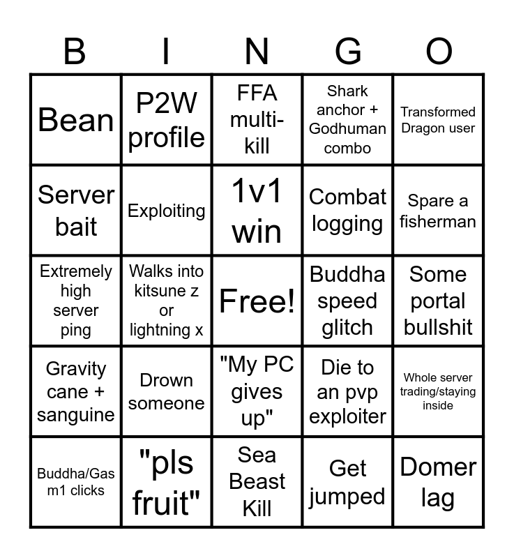 This bingo card has a free space and 36 words: Spammer, Ice user, Toxic, Exploiting, Die to an pvp exploiter, Gravity cane + sanguine, 1v1 win, Complains about V4, Transformed Dragon user, Skill build, Walks into kitsune z or lightning x, Shark anchor + Godhuman combo, Calls out for running but runs themselves, Buddha speed glitch, Spare a fisherman, Bean, Absolutely get cooked by a secret 30 mil, Drown someone, Domer lag, FFA multi-kill, Some portal bullshit, Whole server trading/staying inside, "pls fruit", Buddha/Gas m1 clicks, Sea Beast Kill, P2W profile, Extremely high server ping, Get clipped into a wall/floor, Combat logging, Server bait, Get accused of hacking, Full bot grinding server, Get jumped, "My PC gives up", Garbage gacha luck and One shot someone with v4/bailed out of mink tornades.