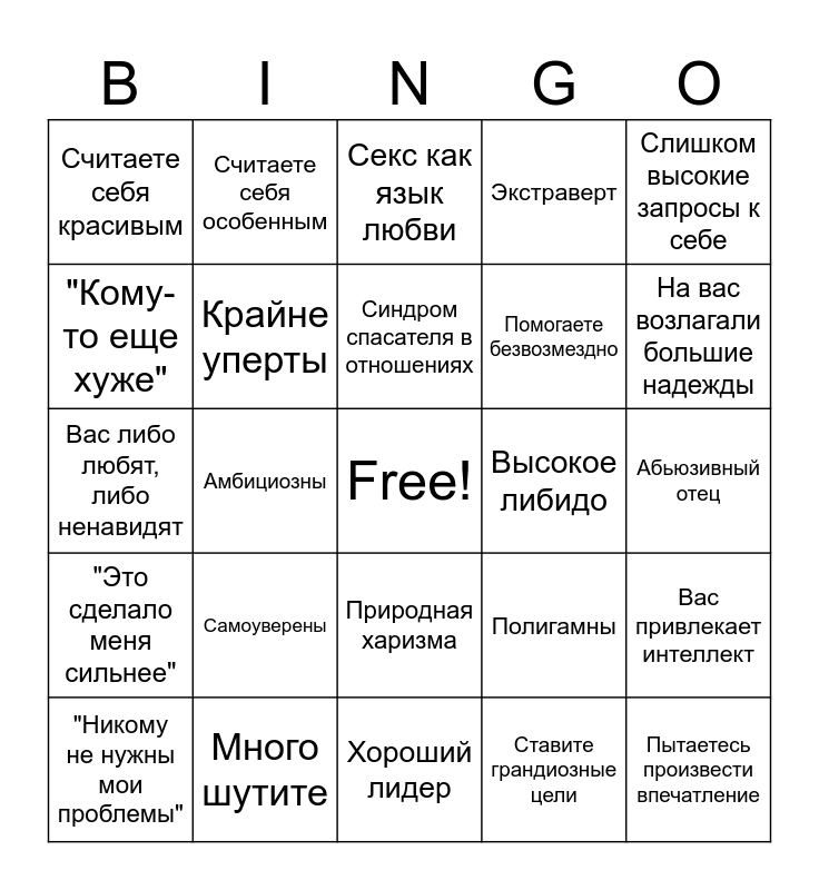 This bingo card has a free space and 24 words: Самоуверены, Много шутите, Синдром спасателя в отношениях, "Никому не нужны мои проблемы", Слишком высокие запросы к себе, Считаете себя красивым, "Кому-то еще хуже", Считаете себя особенным, Высокое либидо, Природная харизма, Помогаете безвозмездно, Вас либо любят, либо ненавидят, Полигамны, Вас привлекает интеллект, Крайне уперты, Ставите грандиозные цели, Абьюзивный отец, Секс как язык любви, На вас возлагали большие надежды, Амбициозны, Пытаетесь произвести впечатление, "Это сделало меня сильнее", Экстраверт and Хороший лидер.