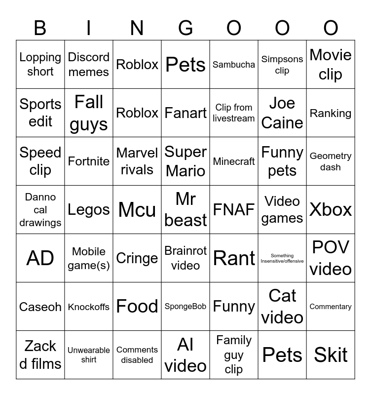 This bingo card has 49 words: Caseoh, Fortnite, Food, Brainrot video, Minecraft, Video games, Movie clip, Zack d films, Fall guys, Mcu, Fanart, Sambucha, Joe Caine, Geometry dash, AD, Mobile game(s), Roblox, Super Mario, Family guy clip, Simpsons clip, Ranking, Sports edit, Discord memes, Roblox, AI video, Clip from livestream, Funny pets, Commentary, Lopping short, Legos, Comments disabled, SpongeBob, Rant, Cat video, Xbox, Danno cal drawings, Knockoffs, Cringe, Mr beast, FNAF, Pets, POV video, Speed clip, Unwearable shirt, Marvel rivals, Pets, Funny, Something Insensitive/offensive and Skit.