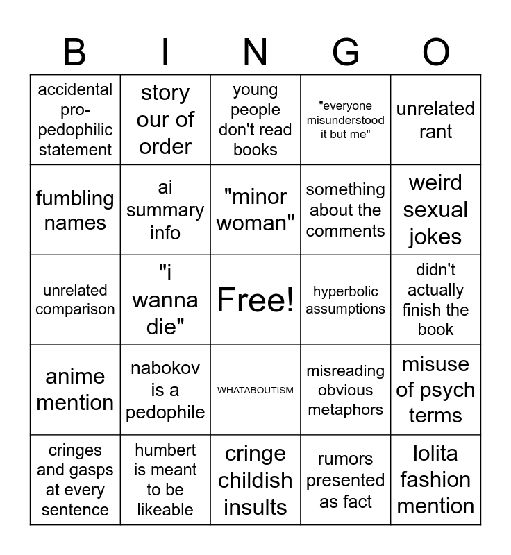This bingo card has a free space and 24 words: nabokov is a pedophile, humbert is meant to be likeable, "minor woman", cringes and gasps at every sentence, unrelated rant, accidental pro-pedophilic statement, fumbling names, story our of order, hyperbolic assumptions, WHATABOUTISM, something about the comments, unrelated comparison, misreading obvious metaphors, misuse of psych terms, ai summary info, rumors presented as fact, didn't actually finish the book, young people don't read books, weird sexual jokes, "i wanna die", lolita fashion mention, anime mention, "everyone misunderstood it but me" and cringe childish insults.