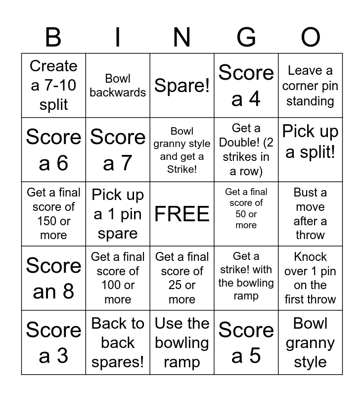 This bingo card has a free space and 29 words: Strike!, Back to back spares!, Spare!, Score a 9, Leave a corner pin standing, Create a 7-10 split, Score a 7, Bowl granny style and get a Strike!, Get a final score of 50 or more, Knock over 1 pin on the first throw, Score a 3, Pick up a 1 pin spare, Score a 5, Bowl granny style, Get a final score of 150 or more, Get a score of 75 or more, Use the bowling ramp, Get a strike! with the bowling ramp, Pick up a split!, Score an 8, Get a final score of 100 or more, Bowl a frame while wearing a funny mask, Get a Double! (2 strikes in a row), Bust a move after a throw, Score a 6, Bowl backwards, Get a final score of 25 or more, Score a 4 and Score a 2.
