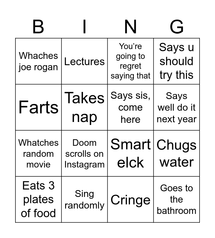 This bingo card has 17 words: Cringe, Eats 3 plates of food, You’re going to regret saying that, Whaches joe rogan, Doom scrolls on Instagram, Says u should try this, Chugs water, Says sis, come here, Says well do it next year, Takes nap, Sing randomly, Smart elck, Farts, Lectures, Whatches random movie, Drinks and Goes to the bathroom.