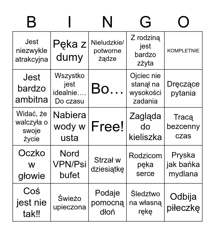 This bingo card has a free space and 24 words: Nord VPN/Psi bufet, Świeżo upieczona, Bo…, Coś jest nie tak‼️, KOMPLETNIE, Jest niezwykle atrakcyjna, Jest bardzo ambitna, Pęka z dumy, Zagląda do kieliszka, Strzał w dziesiątkę, Ojciec nie stanął na wysokości zadania, Widać, że walczyła o swoje życie, Rodzicom pęka serce, Pryska jak bańka mydlana, Wszystko jest idealnie…. Do czasu, Śledztwo na własną rękę, Tracą bezcenny czas, Nieludzkie/ potworne żądze, Dręczące pytania, Nabiera wody w usta, Odbija piłeczkę, Oczko w głowie, Z rodziną jest bardzo zżyta and Podaje pomocną dłoń.
