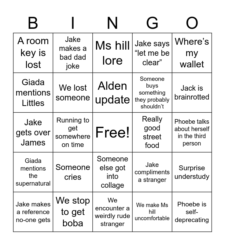 This bingo card has a free space and 38 words: Wig 2, Jake eats something he shouldn’t, Random stranger asks jack how tall he is, We lost someone, Surprise understudy, Someone cries, Alden update, Something important was forgotten, Where’s my wallet, Someone buys something they probably shouldn’t, Running to get somewhere on time, Jake says “let me be clear”, Phoebe is self-deprecating, Phoebe talks about herself in the third person, Giada mentions Littles, Giada mentions the supernatural, Giada mentions marvel, Ms hill lore, Argument over directions, Really good street food, A room key is lost, We stop to get boba, Jack is brainrotted, Jake makes a reference no-one gets, We find out who Sadie Sink is playing, We encounter a weirdly rude stranger, Jake rant over 30 seconds, Phoebe gets sad that Giada is leaving, Jack talks about DEH, Phoebe gets sad over something really stupid, Jack doesn’t believe Jake, Someone else got into collage, We make Ms hill uncomfortable, Jake makes a bad dad joke, Giada complains about AP english, Jake compliments a stranger, Jake gets over James and More news about James.