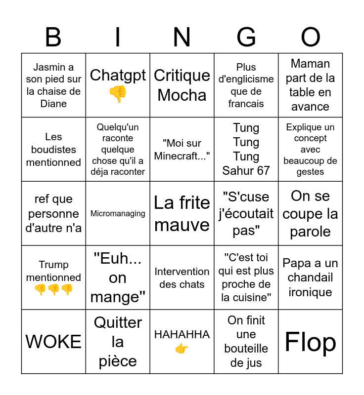 This bingo card has a free space and 24 words: ''Euh... on mange'', Quitter la pièce, "Moi sur Minecraft...", WOKE, Maman part de la table en avance, Jasmin a son pied sur la chaise de Diane, Les boudistes mentionned, Chatgpt 👎, "S'cuse j'écoutait pas", Intervention des chats, Tung Tung Tung Sahur 67, ref que personne d'autre n'a, ''C'est toi qui est plus proche de la cuisine'', Papa a un chandail ironique, Quelqu'un raconte quelque chose qu'il a déja raconter, On finit une bouteille de jus, On se coupe la parole, Critique Mocha, Explique un concept avec beaucoup de gestes, Micromanaging, Flop, Trump mentionned 👎👎👎, Plus d'englicisme que de francais and HAHAHHA 👉.