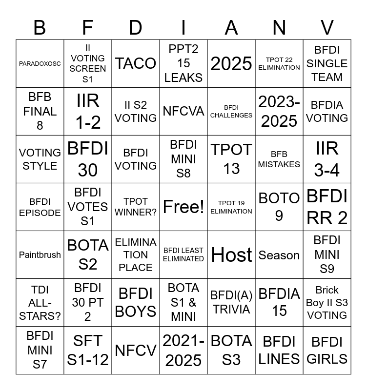 This bingo card has a free space and 48 words: BFDI(A) TRIVIA, 2023-2025, 2021-2025, BFDI VOTES S1, BFDI VOTING, BFDI RR 2, II VOTING SCREEN S1, SFT S1-12, TPOT 22 ELIMINATION, BFDI LEAST ELIMINATED, BFDI SINGLE TEAM, PPT2 15 LEAKS, BFB MISTAKES, TPOT 13, TDI ALL-STARS?, BOTO 9, BFB FINAL 8, BFDIA VOTING, BFDIA 15, 2025, BFDI CHALLENGES, TPOT WINNER?, PARADOXOSC, IIR 1-2, Brick Boy II S3 VOTING, II S2 VOTING, IIR 3-4, BFDI MINI S7, BFDI MINI S8, BFDI 30, BFDI LINES, TPOT 19 ELIMINATION, BFDI MINI S9, BFDI 30 PT 2, BFDI EPISODE, Host, Season, VOTING STYLE, ELIMINA TION PLACE, BFDI BOYS, Paintbrush, BFDI GIRLS, TACO, NFCV, NFCVA, BOTA S1 & MINI, BOTA S2 and BOTA S3.