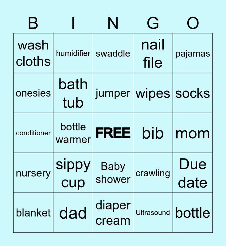 This bingo card has a free space and 82 words: baby monitor, detergent, swaddle, bassinet, lotion, baby swing, rocker, medicine, teether, toys, mittens, thermometer, bath tub, bib, nursing pillow, wash cloths, blanket, onesies, wipe warmer, book, pacifier, wipes, bottle, pajamas, bottle warmer, bouncer, burp cloths, car seat, clothes, crib, sippy cup, shampoo, conditioner, diaper bag, shoes, diaper cream, diapers, baby carrier, socks, booties, nail clippers, nail file, high chair, towel, spoons, humidifier, stroller, jumper, registry, baby food, baby, mom, dad, babysitter, lullaby, cravings, changing table, blocks, milk, crawling, walking, tummy time, nursery, pack-n-play, nightlight, rattle, rocking chair, aunt, uncle, grandmother, grandfather, cousin, Baby shower, Ultrasound, Baby walker, Rubber ducky, Pregnancy, Formula, Son, Daughter, Due date and Potty train.