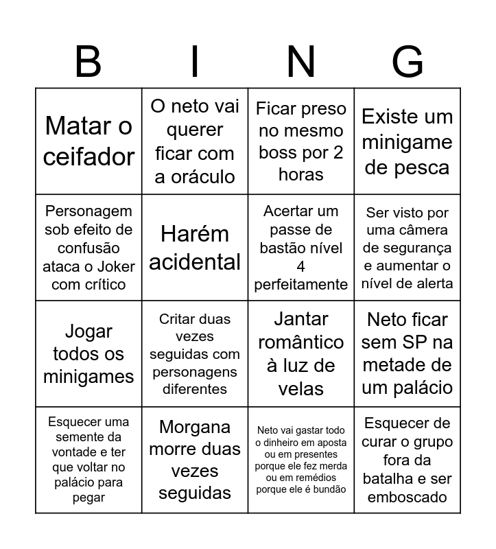 This bingo card has 16 words: Morgana morre duas vezes seguidas, Neto ficar sem SP na metade de um palácio, Ficar preso no mesmo boss por 2 horas, Matar o ceifador, Jogar todos os minigames, O neto vai querer ficar com a oráculo, Jantar romântico à luz de velas, Neto vai gastar todo o dinheiro em aposta ou em presentes porque ele fez merda ou em remédios porque ele é bundão, Personagem sob efeito de confusão ataca o Joker com crítico, Harém acidental, Esquecer uma semente da vontade e ter que voltar no palácio para pegar, Existe um minigame de pesca, Critar duas vezes seguidas com personagens diferentes, Ser visto por uma câmera de segurança e aumentar o nível de alerta, Acertar um passe de bastão nível 4 perfeitamente and Esquecer de curar o grupo fora da batalha e ser emboscado.