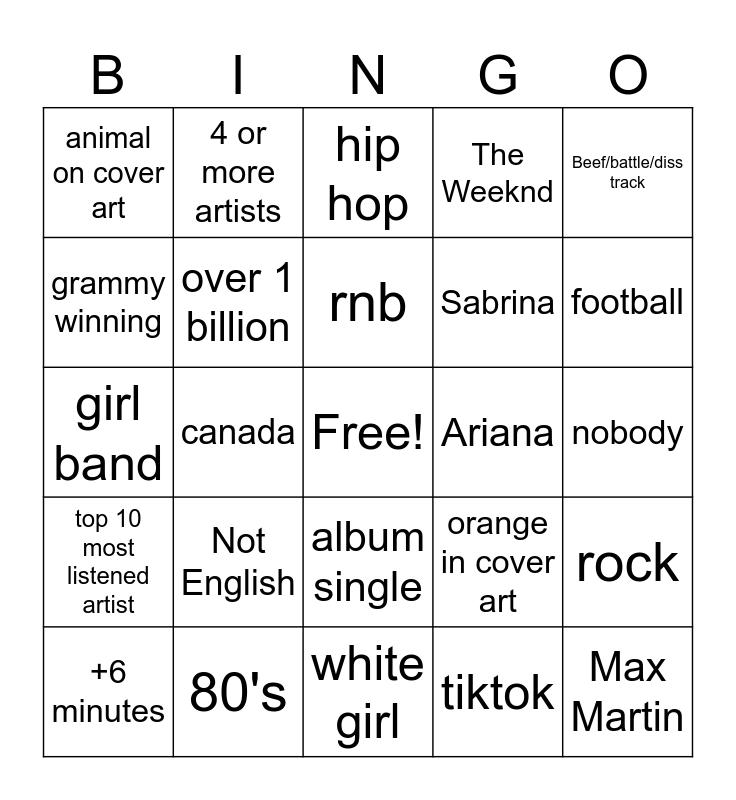 This bingo card has a free space and 24 words: Not English, 80's, rnb, +6 minutes, Beef/battle/diss track, animal on cover art, grammy winning, 4 or more artists, Ariana, album single, Sabrina, girl band, orange in cover art, rock, over 1 billion, tiktok, nobody, hip hop, football, canada, Max Martin, top 10 most listened artist, The Weeknd and white girl.