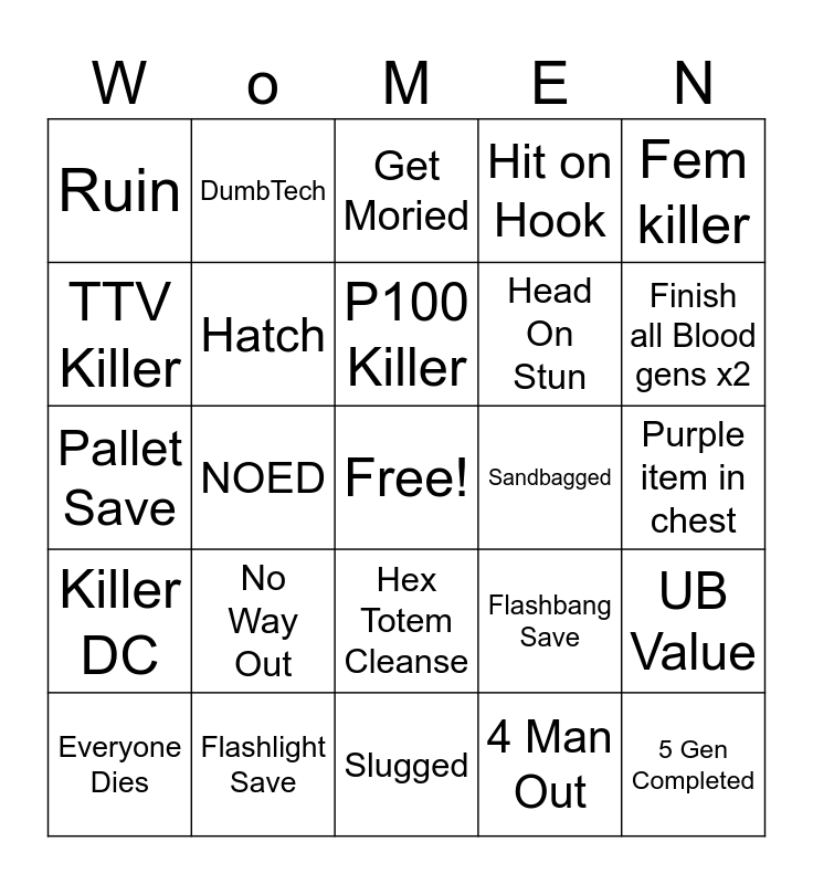 This bingo card has a free space and 24 words: No Way Out, Flashlight Save, P100 Killer, Everyone Dies, Fem killer, Ruin, TTV Killer, DumbTech, Sandbagged, Hex Totem Cleanse, Head On Stun, Pallet Save, Flashbang Save, UB Value, Hatch, 4 Man Out, Purple item in chest, Get Moried, Finish all Blood gens x2, NOED, 5 Gen Completed, Killer DC, Hit on Hook and Slugged.