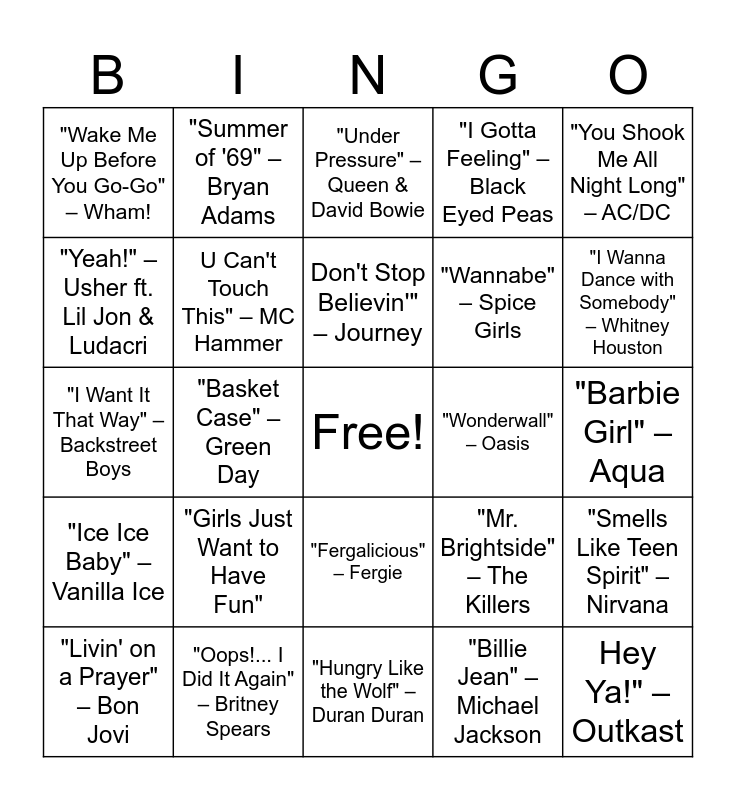 This bingo card has a free space and 25 words: "Livin' on a Prayer" – Bon Jovi, "Girls Just Want to Have Fun", Don't Stop Believin'" – Journey, "Billie Jean" – Michael Jackson, "I Wanna Dance with Somebody" – Whitney Houston, "Wake Me Up Before You Go-Go" – Wham!, "Summer of '69" – Bryan Adams, "Under Pressure" – Queen & David Bowie, "Wannabe" – Spice Girls, "Smells Like Teen Spirit" – Nirvana, "I Want It That Way" – Backstreet Boys, U Can't Touch This" – MC Hammer, "Mr. Brightside" – The Killers, Hey Ya!" – Outkast, "Yeah!" – Usher ft. Lil Jon & Ludacri, "Oops!... I Did It Again" – Britney Spears, "Hungry Like the Wolf" – Duran Duran, "I Gotta Feeling" – Black Eyed Peas, "Barbie Girl" – Aqua, "Ice Ice Baby" – Vanilla Ice, "Basket Case" – Green Day, "Fergalicious" – Fergie, "Wonderwall" – Oasis, "You Shook Me All Night Long" – AC/DC and "Closing Time" – Semisonic.