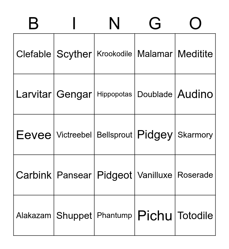 This bingo card has 190 words: Chikorita, Tepig, Totodile, Fletchling, Fletchinder, Talonflame, Bunnelby, Diggersby, Scatterbug, Spewpa, Vivillon, Weedle, Kakuna, Beedrill, Pidgey, Pidgeotto, Pidgeot, Mareep, Flaaffy, Ampharos, Patrat, Watchog, Budew, Roselia, Roserade, Magikarp, Gyarados, Binacle, Barbaracle, Staryu, Starmie, Flabébé, Floette, Florges, Skiddo, Gogoat, Espurr, Meowstic, Litleo, Pyroar, Pancham, Pangoro, Trubbish, Garbodor, Dedenne, Pichu, Pikachu, Raichu, Cleffa, Clefairy, Clefable, Spinarak, Ariados, Ekans, Arbok, Abra, Kadabra, Alakazam, Gastly, Haunter, Gengar, Venipede, Whirlipede, Scolipede, Honedge, Doublade, Aegislash, Bellsprout, Weepinbell, Victreebel, Pansage, Simisage, Pansear, Simisear, Panpour, Simipour, Meditite, Medicham, Electrike, Manectric, Ralts, Gardevoir, Gallade, Houndour, Houndoom, Swablu, Altaria, Audino, Spritzee, Swirlix, Eevee, Vaporeon, Jolteon, Flareon, Leafeon, Glaceon, Sylveon, Buneary, Lopunny, Shuppet, Banette, Vanillite, Vanilluxe, Numel, Camerupt, Hippopotas, Hippowdon, Drilbur, Excadrill, Sandile, Krokorok, Krookodile, Machop, Machoke, Machamp, Gible, Garchomp, Carbink, Sableye, Mawile, Absol, Riolu, Lucario, Slowpoke, Slowbro, Carvanha, Sharpedo, Tynamo, Eelektross, Dratini, Dragonair, Dragonite, Bulbasaur, Charmander, Squirtle, Stunfisk, Furfrou, Inkay, Malamar, Skrelp, Dragalge, Clauncher, Clawitzer, Delibird, Snorunt, Froslass, Snover, Abomasnow, Bergmite, Avalugg, Scyther, Pinsir, Heracross, Emolga, Hawlucha, Phantump, Trevenant, Scraggy, Scrafty, Noibat, Noivern, Klefki, Litwick, Lampent, Chandelure, Aerodactyl, Tyrunt, Amaura, Onix, Aron, Lairon, Aggron, Helioptile, Heliolisk, Pumpkaboo, Gourgeist, Larvitar, Tyranitar, Froakie, Falinks, Chespin, Skarmory, Fennekin, Bagon, Salamence, Kangaskhan, Drampa, Beldum, Metang and Metagross.