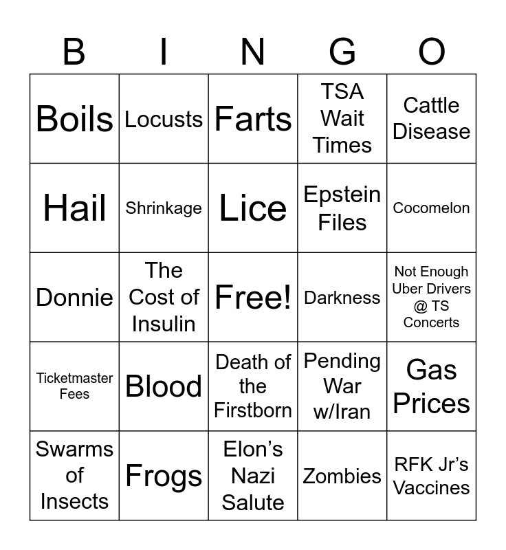 This bingo card has a free space and 24 words: Blood, Frogs, Lice, Swarms of Insects, Cattle Disease, Boils, Hail, Locusts, Darkness, Death of the Firstborn, Epstein Files, Donnie, Pending War w/Iran, Gas Prices, Shrinkage, Zombies, Not Enough Uber Drivers @ TS Concerts, Farts, Cocomelon, The Cost of Insulin, RFK Jr’s Vaccines, Ticketmaster Fees, TSA Wait Times and Elon’s Nazi Salute.