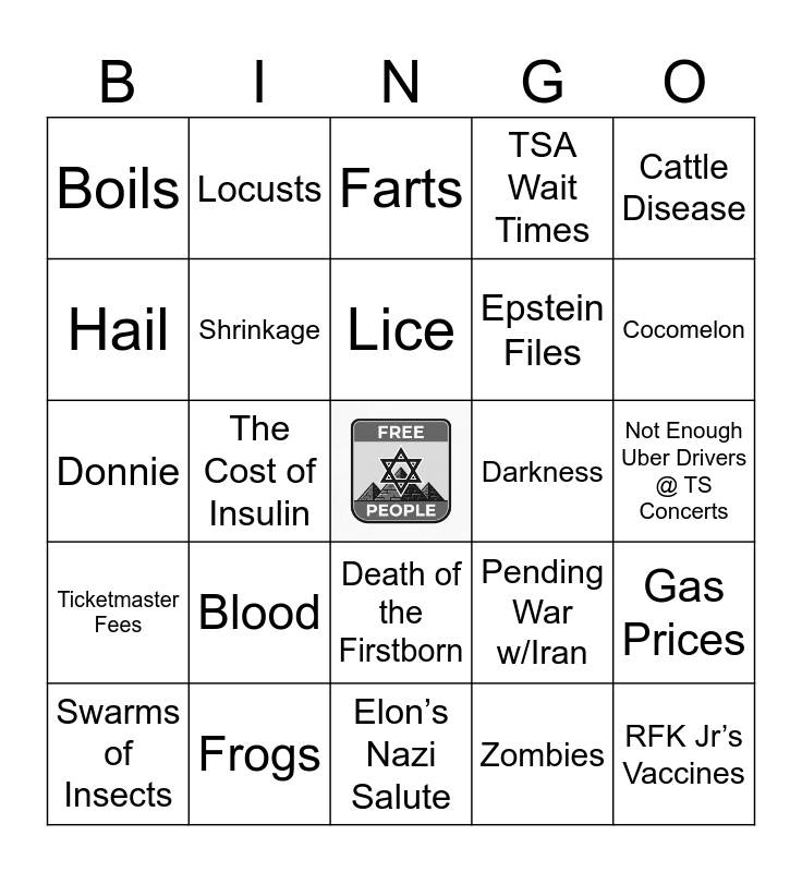 This bingo card has a free space and 24 words: Blood, Frogs, Lice, Swarms of Insects, Cattle Disease, Boils, Hail, Locusts, Darkness, Death of the Firstborn, Epstein Files, Donnie, Pending War w/Iran, Gas Prices, Shrinkage, Zombies, Not Enough Uber Drivers @ TS Concerts, Farts, Cocomelon, The Cost of Insulin, RFK Jr’s Vaccines, Ticketmaster Fees, TSA Wait Times and Elon’s Nazi Salute.
