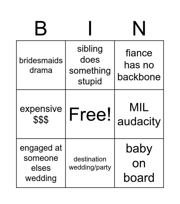 This bingo card has a free space and 8 words: MIL audacity, fiance has no backbone, sibling does something stupid, engaged at someone elses wedding, bridesmaids drama, baby on board, expensive $$$ and destination wedding/party.
