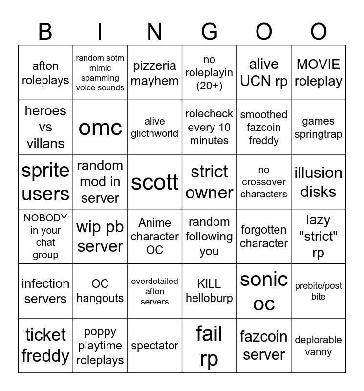 This bingo card has 36 words: NOBODY in your chat group, wip pb server, spectator, rolecheck every 10 minutes, no crossover characters, illusion disks, afton roleplays, poppy playtime roleplays, pizzeria mayhem, KILL helloburp, smoothed fazcoin freddy, MOVIE roleplay, infection servers, random mod in server, alive glicthworld, no roleplayin (20+), sonic oc, lazy "strict" rp, heroes vs villans, omc, Anime character OC, random following you, forgotten character, prebite/post bite, sprite users, random sotm mimic spamming voice sounds, scott, fail rp, alive UCN rp, games springtrap, ticket freddy, OC hangouts, overdetailed afton servers, strict owner, fazcoin server and deplorable vanny.