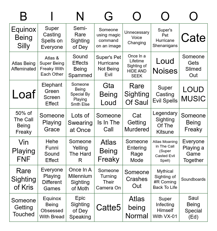 This bingo card has a free space and 48 words: Someone Crashes Out, Loud Noises, Catte5, Someone Playing Grace, Someone Being Special By Playing Smth Else, Someone Being Freaky, Super Casting Spells on Everyone, Equinox Being Obsessed With Bread, Super's Pet Hurricane Shenanigans, Atlas Being Freaky, Cate, Someone using magic command on an image, Super Casting Evil Spells, Rare Sighting Of Saul, Rare Sighting of Kris, Legendary Sighting Of The Kitsune, Atlas Being Affeminated, Someone Gets Slimed Out, Mythical Sighting of #R Coming Back To Life, Unnecessary Voice Changing, Once In a Lifetime Sighting of HIDE AND SEEK, Lots of Swearing at Once, Equinox Being Silly, Atlas & Super Being Freaky With Each Other, Soundboards, Sound Effects Being Spammed, LOUD MUSIC, Someone Getting Touched, Gta Being Loud, Elephant Green Screen Effect, Super Infecting Himself With VX-01, Cat Getting Murdered, Everyone Playing a Game Together, Everyone Playing Different Games, 50% of The Call Being Freaky, Someone Entering Rage Mode, Atlas Moaning in The Call (Super Casted Evil Spell), Loaf, Someone Yelling The Hard R, Once In A Milennium Sighting of Moth, Vin Playing FNF, Saul Being Special (Ed), Semi-Rare Sighting of Dey, Epic Sighting of Dey Speaking, Super's Pet Hurricane Not Being Evil, Someone Turning Their Camera On, Hehe Funni Sound Effect and Atlas being Normal.