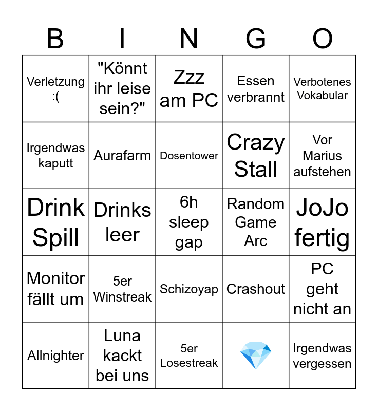 This bingo card has 25 words: 5er Winstreak, 5er Losestreak, Dosentower, Allnighter, Verbotenes Vokabular, Verletzung :(, Irgendwas kaputt, "Könnt ihr leise sein?", Random Game Arc, Schizoyap, Crazy Stall, Drink Spill, Crashout, PC geht nicht an, Aurafarm, Irgendwas vergessen, JoJo fertig, Zzz am PC, Vor Marius aufstehen, Drinks leer, 6h sleep gap, Luna kackt bei uns, Monitor fällt um, Essen verbrannt and 💎.