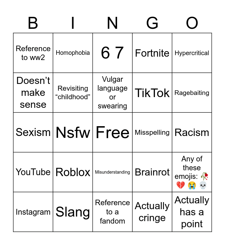 This bingo card has a free space and 24 words: Instagram, Roblox, Vulgar language or swearing, Actually cringe, Hypercritical, Reference to ww2, Homophobia, 6 7, Misspelling, Racism, Sexism, Revisiting “childhood”, Brainrot, Any of these emojis: 🥀 💔 😭 💀, Doesn’t make sense, Slang, Reference to a fandom, Fortnite, Ragebaiting, YouTube, Nsfw, Misunderstanding, TikTok and Actually has a point.