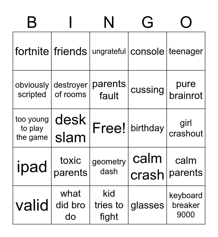 This bingo card has a free space and 24 words: toxic parents, what did bro do, parents fault, valid, teenager, fortnite, obviously scripted, friends, birthday, geometry dash, cussing, too young to play the game, calm crash, calm parents, destroyer of rooms, glasses, girl crashout, ungrateful, pure brainrot, desk slam, keyboard breaker 9000, ipad, console and kid tries to fight.