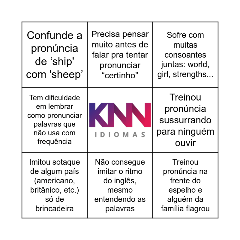 This bingo card has a free space and 33 words: Se pegou pensando em como pronunciar uma palavra em inglês no meio do dia (tipo mania boa), Recebeu feedback de professor(a) dizendo que sua pronúncia melhorou, Treinou pronúncia repetindo a mesma frase várias vezes até ficar satisfeito(a), Usou uma frase de série/filme em uma conversa real em inglês, Já participou de reunião em inglês e entendeu bem, Imitou sotaque de algum país (americano, britânico, etc.) só de brincadeira, Treinou pronúncia na frente do espelho e alguém da família flagrou, Já tentou falar uma palavra em inglês e acabou inventando outra na hora, Precisa pensar muito antes de falar pra tentar pronunciar “certinho”, Ouve várias palavras juntas pensando que é tudo uma palavra só, Não consegue imitar o ritmo do inglês, mesmo entendendo as palavras, Sofre com muitas consoantes juntas: world, girl, strengths..., Pronuncia o ED no final de todas as palavras: kissed, started, liked, asked..., Falou inglês com um estrangeiro sem travar muito, Treinou pronúncia sozinho(a) usando YouTube, série ou música, Conseguiu entender uma música/série sem legenda (ou com legenda em inglês), Já gravou um áudio em inglês e ficou orgulhoso(a) da pronúncia, Travou completamente ao tentar falar uma frase simples em inglês, Imitou pronúncia de filme/série na brincadeira (tipo “Oh my God!” exagerado), Tem vergonha de falar inglês em público, Acha difícil entender nativos falando rápido, Já falou “beach” com medo de falar errado, Confunde a pronúncia de ‘ship' com 'sheep’, Tem dificuldade com as palavras: think, this, them, those, thanks, Sente que entende melhor o inglês escrito do que o falado por causa da pronúncia, Sente que a pronúncia ‘não sai’ mesmo sabendo como deveria ser na teoria, Tem dificuldade em lembrar como pronunciar palavras que não usa com frequência, Já respondeu “yes” ou “ok” sem entender direito, Treinou pronúncia sussurrando para ninguém ouvir, Já disse ‘curse’ ao invés de dizer ‘course', Teve a sensação de ‘caramba, falei bonito agora’, Já entendeu uma piada, trocadilho ou jogo de palavras em inglês por causa da pronúncia and Sentiu que conseguiu acompanhar o ritmo de uma música ou diálogo em inglês sem se perder.