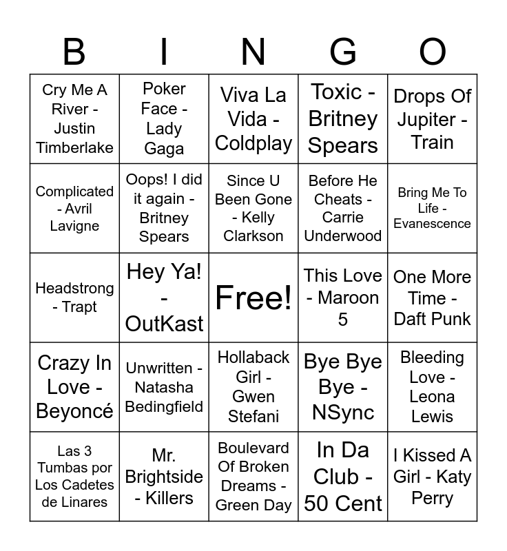 This bingo card has a free space and 32 words: In Da Club - 50 Cent, Hot In Herre - Nelly, Hey Ya! - OutKast, I Gotta Feeling - Black Eyed Peas, Crazy In Love - Beyoncé, Oops! I did it again - Britney Spears, Drops Of Jupiter - Train, Bleeding Love - Leona Lewis, Poker Face - Lady Gaga, Dear Maria Count me in - All Time Low, Since U Been Gone - Kelly Clarkson, Viva La Vida - Coldplay, Where is The Love - Black Eyed Peas, Blow the Whistle - Too Short, This Love - Maroon 5, In The End - Lincoln Park, Las 3 Tumbas por Los Cadetes de Linares, Headstrong - Trapt, Hollaback Girl - Gwen Stefani, Unwritten - Natasha Bedingfield, Bye Bye Bye - NSync, Can't Get You Out Of My Head - Kylie Minogue, One More Time - Daft Punk, Mr. Brightside - Killers, I Kissed A Girl - Katy Perry, Toxic - Britney Spears, Before He Cheats - Carrie Underwood, Complicated - Avril Lavigne, Cry Me A River - Justin Timberlake, Boulevard Of Broken Dreams - Green Day, Feel Good Inc - Gorillaz and Bring Me To Life - Evanescence.