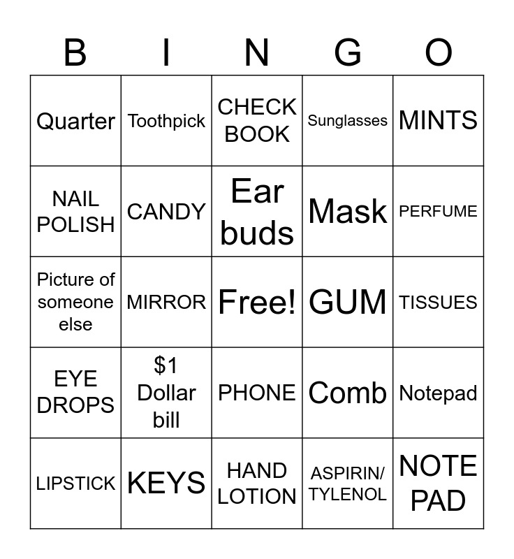 This bingo card has a free space and 29 words: LIPSTICK, TWEEZERS, MIRROR, NAIL CLIPPERS, Quarter, CHECK BOOK, CANDY, $1 Dollar bill, GUM, KEYS, TISSUES, NOTE PAD, HAND LOTION, ASPIRIN/ TYLENOL, PERFUME, PEN, PHONE, EYE DROPS, MINTS, Picture of someone else, Comb, GIFT CARD, Mask, NAIL POLISH, Sunglasses, Toothpick, Notepad, Ear buds and Receipt.