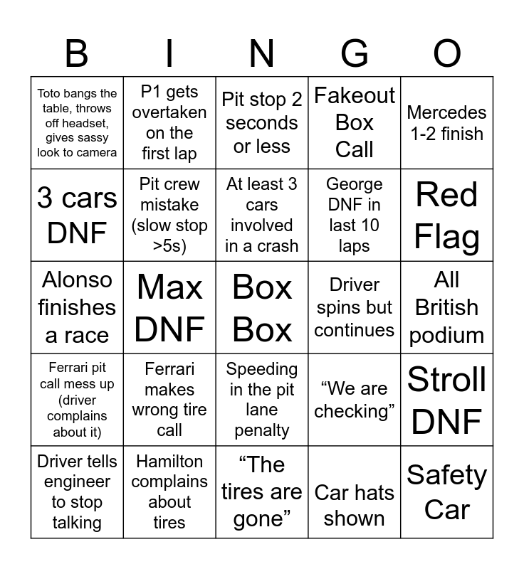 This bingo card has a free space and 67 words: DNS, Williams top 10, Any team Double DNF, Stroll DNF, All cars finish the race, Teammates Collide, P1 gets overtaken on the first lap, Crash at the first corner, At least 3 cars involved in a crash, At least 4 cars involved in a crash, Speeding in the pit lane penalty, Failure to complete a penalty, All British podium, Mercedes 1-2 finish, 2+ safety cars, 3 cars DNF, Max DNF, Toto bangs the table, throws off headset, gives sassy look to camera, Hadjar outscores Max, George DNF in last 10 laps, Ferrari makes wrong tire call, Ferrari pit call mess up (driver complains about it), Fakeout Box Call, Car hats shown, Audi podium, Stroll takes someone else out, New race winner, 2 Red flags in a race, Red Flag, Yellow Flag, Safety Car, Virtual Safety Car, Unsafe Release Penalty, Close call in the pit lane, Any WAG is shown in garage, Driver tells engineer to stop talking, Driver starts race from pit lane, “We are checking”, Alonso finishes a race, Ocon crashes into someone, Perez crashes into someone, Pit crew mistake (slow stop >5s), Driver spins but continues, Driver ignores team instruction, Driver argues about tire choice, Camera shows random celebrity during race, Alonso complains, Hamilton complains about tires, Double-stack pit stop, Fire extinguisher used on car, Pit stop 2 seconds or less, Engine failure, Car gets retired, Driver asks to swap positions, Stewards note an incident, “The tires are gone”, Max complains, Wheel gun error, 2+ VSC, Debris on the track, Driver of the day is different than winner of the race, Crash where barriers are disrupted, Bl**ped radio, Pit stop in the first 8 laps, 3 teams on podium, Slow/bad start and Piastri completes 5 laps.