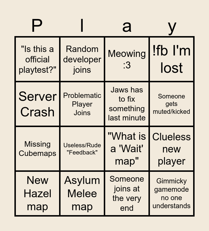 This bingo card has 16 words: Asylum Melee map, Clueless new player, Meowing :3, "Is this a official playtest?", Missing Cubemaps, Random developer joins, "What is a 'Wait' map", Someone joins at the very end, Server Crash, Problematic Player Joins, New Hazel map, !fb I'm lost, Useless/Rude "Feedback", Someone gets muted/kicked, Jaws has to fix something last minute and Gimmicky gamemode no one understands.