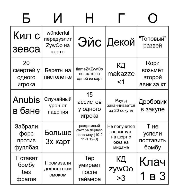 This bingo card has a free space and 24 words: Больше 3х карт, Промазали дефолтным смоком, flameZ>ZywOo по стате на одной из карт, Т ставят бомбу без фрагов, "Топовый" развей, Кил с зевса, 20 смертей у одного игрока, w0nderful передуэлит ZywOo на карте, Раунд заканчивается за 20 секунд, разгромный счёт за первую половину (10-2 11-1 12-0), КД makazze <1, Anubis в бане, Не получится запрыгнуть на шорт с окна на мираже, Т не успели поставить бомбу, Береты на пистолетке, КД zywOo >3, Дробовик в закупе, Эйс, Ropz возьмёт второй авик за кт, Случайный урон от падения, Клач 1 в 3, Забрали форс против фуллбая, Декой and Тер умирает после таймера.
