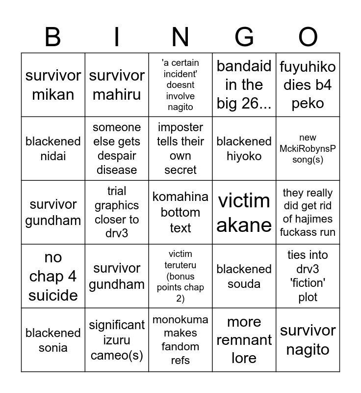 This bingo card has a free space and 24 words: survivor gundham, significant izuru cameo(s), imposter tells their own secret, blackened sonia, fuyuhiko dies b4 peko, survivor mikan, blackened nidai, survivor mahiru, victim akane, victim teruteru (bonus points chap 2), blackened hiyoko, survivor gundham, blackened souda, ties into drv3 'fiction' plot, someone else gets despair disease, more remnant lore, they really did get rid of hajimes fuckass run, 'a certain incident' doesnt involve nagito, new MckiRobynsP song(s), trial graphics closer to drv3, survivor nagito, no chap 4 suicide, bandaid in the big 26... and monokuma makes fandom refs.