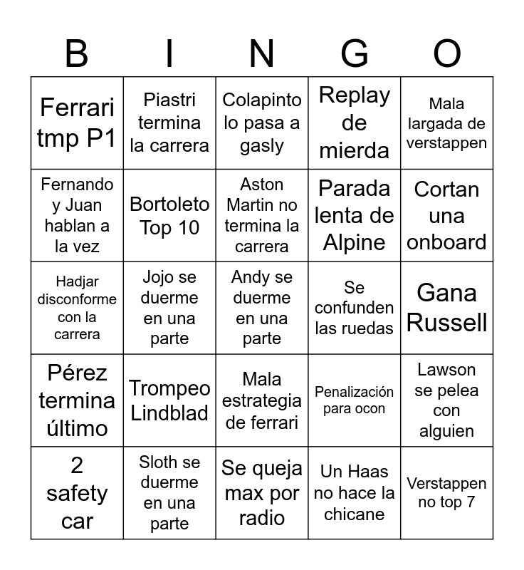 This bingo card has 25 words: Trompeo Lindblad, Se queja max por radio, Aston Martin no termina la carrera, 2 safety car, Mala largada de verstappen, Ferrari tmp P1, Fernando y Juan hablan a la vez, Piastri termina la carrera, Se confunden las ruedas, Mala estrategia de ferrari, Parada lenta de Alpine, Hadjar disconforme con la carrera, Penalización para ocon, Lawson se pelea con alguien, Bortoleto Top 10, Verstappen no top 7, Gana Russell, Colapinto lo pasa a gasly, Cortan una onboard, Jojo se duerme en una parte, Andy se duerme en una parte, Sloth se duerme en una parte, Pérez termina último, Replay de mierda and Un Haas no hace la chicane.