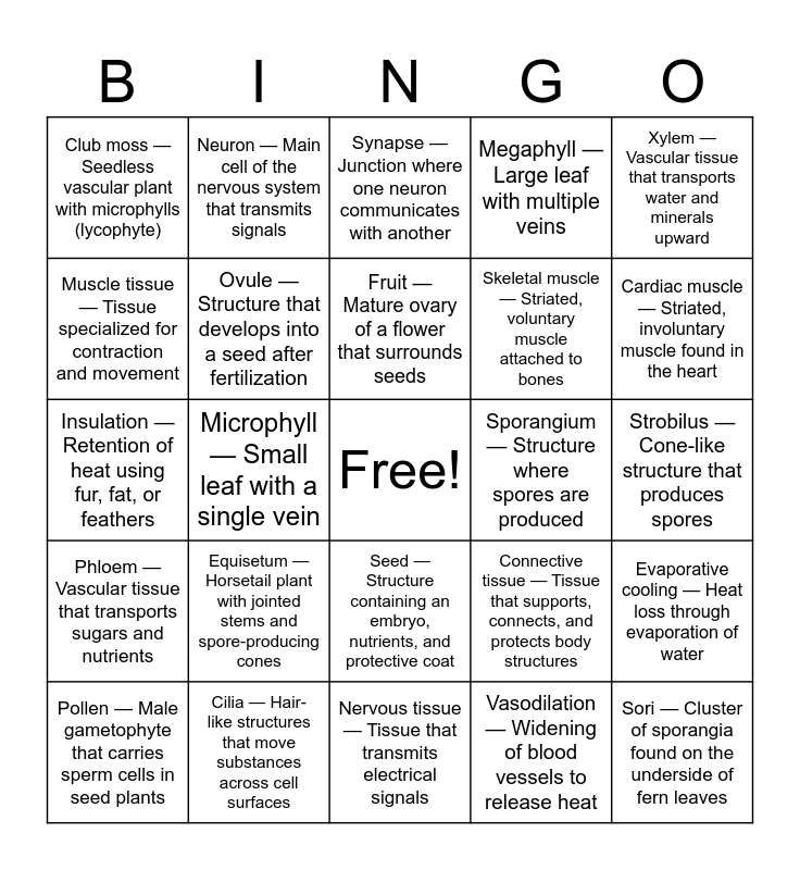 This bingo card has a free space and 39 words: Gymnosperm — Seed-producing plant with “naked seeds” not enclosed in fruit (typically cones), Angiosperm — Flowering plant with seeds enclosed within a fruit, Cone — Reproductive structure of gymnosperms that produces pollen or ovules, Ovule — Structure that develops into a seed after fertilization, Pollen — Male gametophyte that carries sperm cells in seed plants, Seed — Structure containing an embryo, nutrients, and protective coat, Fruit — Mature ovary of a flower that surrounds seeds, Flower — Reproductive structure of angiosperms, Xylem — Vascular tissue that transports water and minerals upward, Phloem — Vascular tissue that transports sugars and nutrients, Microphyll — Small leaf with a single vein, Megaphyll — Large leaf with multiple veins, Sori — Cluster of sporangia found on the underside of fern leaves, Strobilus — Cone-like structure that produces spores, Sporangium — Structure where spores are produced, Equisetum — Horsetail plant with jointed stems and spore-producing cones, Fern — Seedless vascular plant with megaphylls and sori, Club moss — Seedless vascular plant with microphylls (lycophyte), Epithelial tissue — Tissue that lines surfaces, cavities, and organs, Connective tissue — Tissue that supports, connects, and protects body structures, Muscle tissue — Tissue specialized for contraction and movement, Nervous tissue — Tissue that transmits electrical signals, Skeletal muscle — Striated, voluntary muscle attached to bones, Cardiac muscle — Striated, involuntary muscle found in the heart, Smooth muscle — Non-striated, involuntary muscle found in organs, Striated — Muscle with visible banding pattern, Voluntary — Muscle under conscious control, Involuntary — Muscle not under conscious control, Intercalated disks — Specialized connections between cardiac muscle cells that allow synchronized contraction, Neuron — Main cell of the nervous system that transmits signals, Dendrite — Branch-like structure that receives signals from other neurons, Axon — Long structure that sends electrical signals away from the neuron, Synapse — Junction where one neuron communicates with another, Cilia — Hair-like structures that move substances across cell surfaces, Vasodilation — Widening of blood vessels to release heat, Vasoconstriction — Narrowing of blood vessels to conserve heat, Evaporative cooling — Heat loss through evaporation of water, Insulation — Retention of heat using fur, fat, or feathers and Metabolic heat production — Internal heat generation through metabolism.